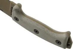 Le Junglas de ESEE Knives est le couteau ultime pour tous ceux qui trouvent une machette trop grande, mais cherchent un grand couteau avec lequel on peut hacher de la vĂ©gĂ©tation. LĂ oĂą de nombreuses machettes sortent de l’emballage Ă peine assez aiguisĂ©es pour ĂŞtre capable de couper, le Junglas sort de l’emballage avec un tranchant rasoir. Et il est bien lourd, de sorte que trancher la vĂ©gĂ©tation se passe très facilement. Le manche en micarta est grand et très ergonomique. Il a une texture rugueuse pour encore plus de confort et d’adhĂ©rence. Si besoin est, les plaquettes de manche en micarta peuvent ĂŞtre dĂ©vissĂ©es.