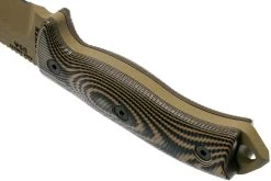 Le ESEE Model 5 est un couteau de survie solide avec une lame en acier au carbone 1095. Au sein de la gamme ESEE, on retrouve Ă©galement l’ESEE 5, ou le « pied de biche tranchant ». Avec une Ă©paisseur de lame allant jusqu’Ă 6,5 mm, c’est vraiment un gros bĂ©bĂ©. Son poids est Ă©galement rĂ©vĂ©lateur : environ 450 grammes. On ne peut pas le rater ! Ă€ l’origine, ESEE a conçu son Modèle 5 pour les pilotes qui devaient se libĂ©rer d’un crash d’avion. C’est donc un couteau robuste très utile. Aujourd’hui, les passionnĂ©s de survie ont Ă©galement dĂ©couvert la puissance de l’ESEE 5. Il vous sera difficile de trouver un couteau de survie plus robuste !