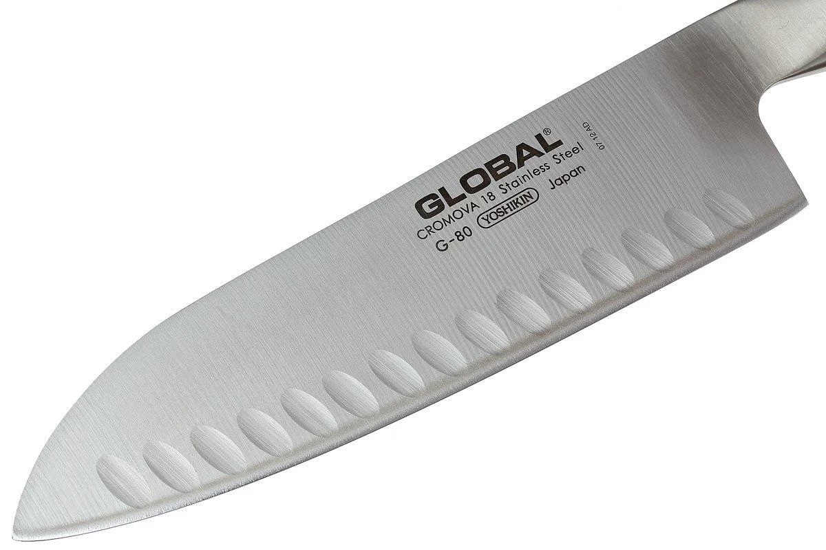 Le couteau santoku Global G80 a une lame dotée de petites alvéoles. Cela évite que les aliments y restent collés. La lame est faite en acier Cromova 18 et est livrée très tranchante. Une finition légèrement matte y a été appliquée.